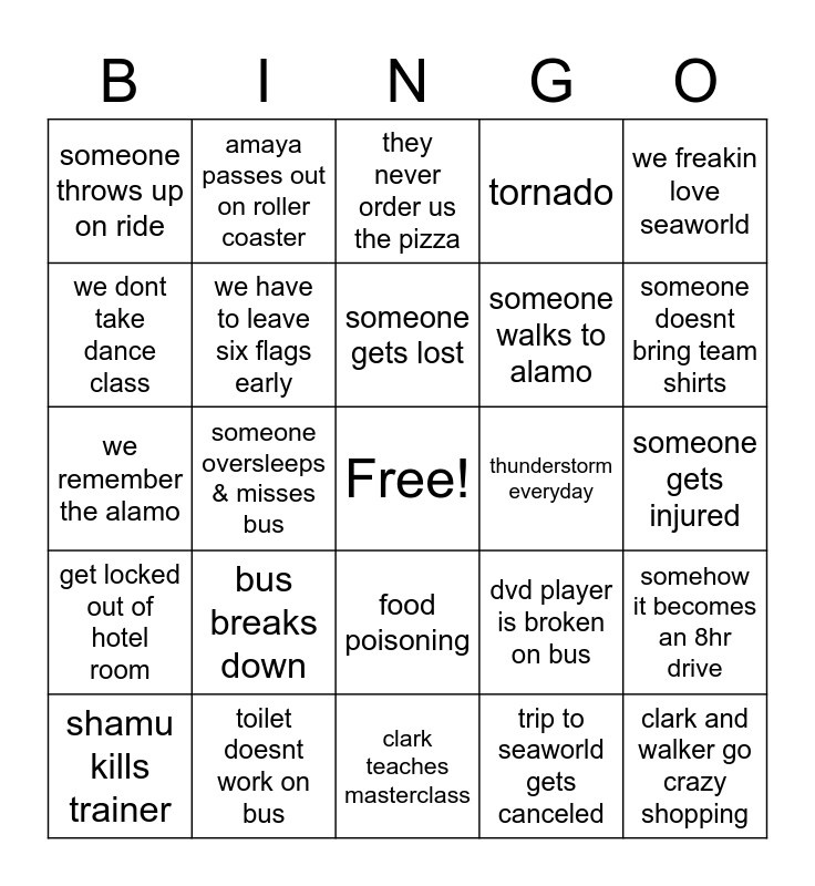 This bingo card has a free space and 24 words: bus breaks down, toilet doesnt work on bus, someone gets lost, shamu kills trainer, we freakin love seaworld, someone throws up on ride, we dont take dance class, amaya passes out on roller coaster, thunderstorm everyday, food poisoning, someone walks to alamo, we remember the alamo, dvd player is broken on bus, somehow it becomes an 8hr drive, we have to leave six flags early, trip to seaworld gets canceled, someone gets injured, they never order us the pizza, someone doesnt bring team shirts, someone oversleeps & misses bus, clark and walker go crazy shopping, get locked out of hotel room, tornado and clark teaches masterclass.