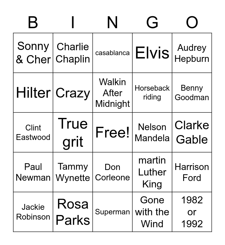This bingo card has a free space and 27 words: martin Luther King, Robert DeNiro, Horseback riding, Superman, Hilter, casablanca, Charlie Chaplin, Paul Newman, Nelson Mandela, Harrison Ford, Clint Eastwood, Elvis, Jackie Robinson, Rosa Parks, Benny Goodman, Jazz, Crazy, Walkin After Midnight, Tammy Wynette, Sonny & Cher, Clarke Gable, Gone with the Wind, True grit, 1982 or 1992, Don Corleone, Audrey Hepburn and Irish Stew.