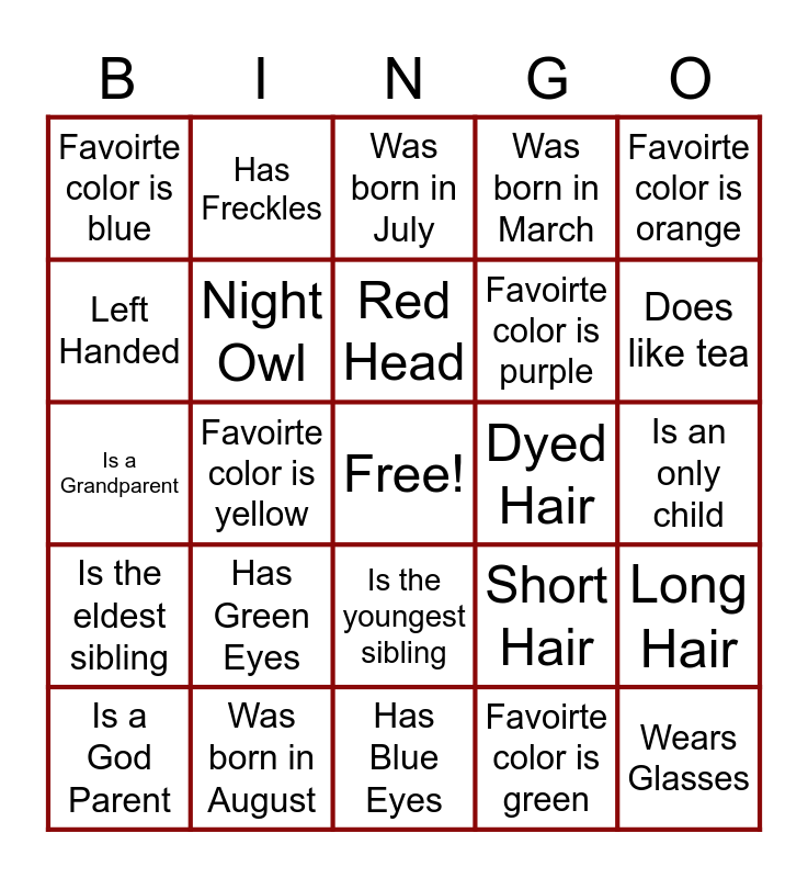 This bingo card has a free space and 52 words: Wears Contacts, Wears Glasses, Has Brown Eyes, Has Blue Eyes, Has Green Eyes, Has Hazel Eyes, Has Freckles, Multilingual, Left Handed, Loves Cheese, Night Owl, Early Bird, Long Hair, Short Hair, Burnette, Blonde, Red Head, Dyed Hair, Favoirte color is red, Favoirte color is orange, Favoirte color is yellow, Favoirte color is green, Favoirte color is blue, Favoirte color is purple, Can't ride a bike, Doesn't like coffee, Does like coffee, Doesn't like tea, Does like tea, Was born in January, Was born in February, Was born in March, Was born in April, Was born in May, Was born in June, Was born in July, Was born in August, Was born in September, Was born in October, Was born in November, Was born in December, Is an only child, Is the eldest sibling, Is the middle sibling, Is the youngest sibling, Previously lived outside of Iowa/Illinois, Is a Parent, Is a Grandparent, Is an Aunt, Is an Uncle, Is a God Parent and Right Handed.