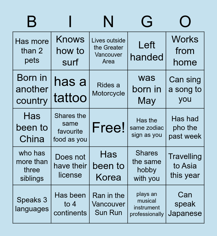 This bingo card has a free space and 24 words: Does not have their license, Has been to 4 continents, Rides a Motorcycle, Speaks 3 languages, Works from home, Has more than 2 pets, Born in another country, Knows how to surf, Has the same zodiac sign as you, Has been to Korea, was born in May, Has been to China, Shares the same hobby with you, Travelling to Asia this year, has a tattoo, plays an musical instrument professionally, Has had pho the past week, Lives outside the Greater Vancouver Area, Can sing a song to you, Shares the same favourite food as you, Can speak Japanese, who has more than three siblings, Left handed and Ran in the Vancouver Sun Run.
