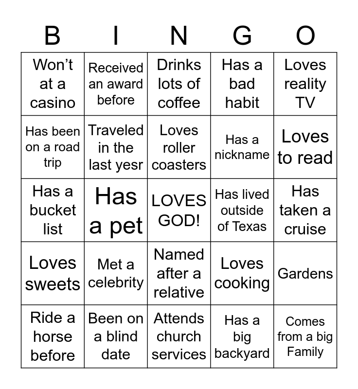 This bingo card has a free space and 24 words: Met a celebrity, Been on a blind date, Loves roller coasters, Ride a horse before, Loves reality TV, Won’t at a casino, Has been on a road trip, Received an award before, Has lived outside of Texas, Named after a relative, Has a nickname, Has a bucket list, Loves cooking, Gardens, Traveled in the last yesr, Has a big backyard, Has taken a cruise, Drinks lots of coffee, Loves to read, Has a pet, Comes from a big Family, Loves sweets, Has a bad habit and Attends church services.