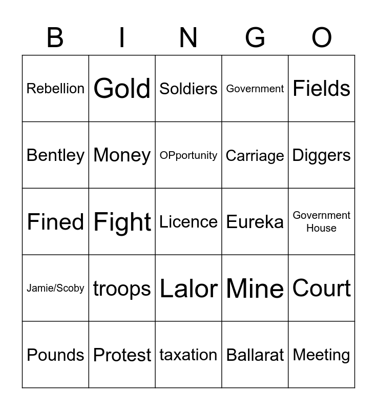 This bingo card has 25 words: troops, taxation, OPportunity, Pounds, Fields, Rebellion, Bentley, Gold, Eureka, Lalor, Carriage, Fined, Mine, Court, Money, Meeting, Government House, Soldiers, Diggers, Fight, Licence, Protest, Jamie/Scoby, Government and Ballarat.