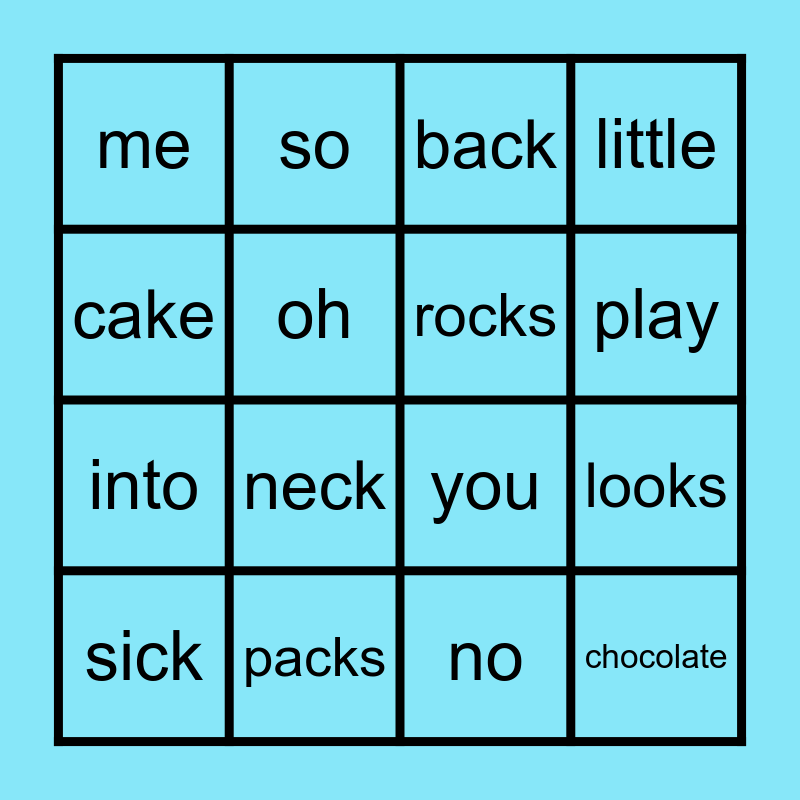 This bingo card has 26 words: say, day, play, plays, cake, me, oh, so, no, go, into, you, hooo, look, looks, some, little, chocolate, back, sick, neck, lock, packs, ducks, rocks and a.