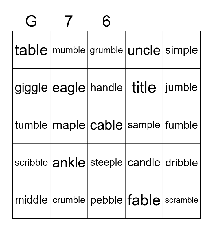 This bingo card has a free space and 24 words: ankle, crumble, handle, middle, simple, table, giggle, mumble, sample, steeple, title, tumble, candle, dribble, eagle, fable, fumble, grumble, jumble, maple, scramble, scribble, uncle and pebble.