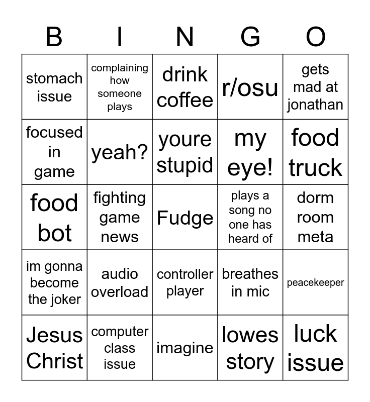 This bingo card has a free space and 24 words: audio overload, computer class issue, youre stupid, Jesus Christ, gets mad at jonathan, stomach issue, focused in game, complaining how someone plays, plays a song no one has heard of, controller player, my eye!, food bot, breathes in mic, peacekeeper, yeah?, lowes story, dorm room meta, drink coffee, food truck, fighting game news, luck issue, im gonna become the joker, r/osu and imagine.