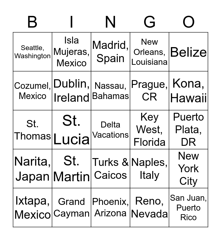This bingo card has a free space and 24 words: St. Martin, Grand Cayman, Nassau, Bahamas, Ixtapa, Mexico, Belize, Seattle, Washington, Cozumel, Mexico, Isla Mujeras, Mexico, Key West, Florida, Turks & Caicos, Prague, CR, St. Thomas, Naples, Italy, New York City, Dublin, Ireland, Reno, Nevada, Puerto Plata, DR, Madrid, Spain, Kona, Hawaii, St. Lucia, San Juan, Puerto Rico, Narita, Japan, New Orleans, Louisiana and Phoenix, Arizona.
