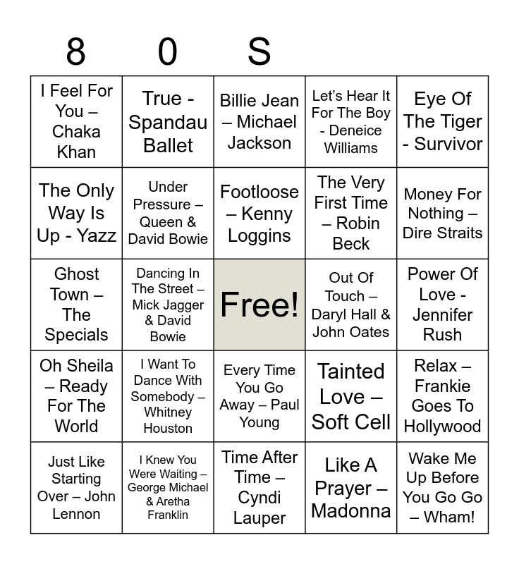 This bingo card has a free space and 90 words: I Think We’re Alone Now - Tiffany, Ghostbusters – Ray Parker Jr, Every Time You Go Away – Paul Young, Every Breath You Take – The Police, The Final Countdown - Foreigner, Every Body Wants To Rule The World – Tears For Fears, You Win Again – Bee Gees, Chain Reaction – Diana Ross, Baby Give It Up – KC & The Sunshine Band, House Of Fun - Madness, The Reflex – Duran Duran, What’s Love Got To Do With It –Tina Turner, Shaddap You Face – Joe Dolce, Power Of Love - Jennifer Rush, Don’t Turn Around – Aswad, Footloose – Kenny Loggins, I Want To Know What Love Is – Foreigner, All Around The World – Lisa Stanfield, Uptown Girl – Billy Joel, Missing You –John Waite, Making Your Mind Up – Bucks Fizz, Let’s Dance – David Bowie, Time After Time – Cyndi Lauper, Ride On Time Black Box, Ghost Town – The Specials, I Knew You Were Waiting – George Michael & Aretha Franklin, Back 2 Life – Soul ii Soul, Don’t Leave Me This Way – The Communards, Don’t You Want Me Baby – Human League, Total Eclipse Of The Heart- Bonnie Tyler, I Don’t Want To Dance – Eddie Grant, Relax – Frankie Goes To Hollywood, A Town Called Malice - The Jam, Oh Sheila – Ready For The World, I Feel For You – Chaka Khan, Let’s Hear It For The Boy - Deneice Williams, Billie Jean – Michael Jackson, When The Going Gets Tough – Billy Ocean, Dancing In The Street – Mick Jagger & David Bowie, Money For Nothing – Dire Straits, Just Like Starting Over – John Lennon, The Only Way Is Up - Yazz, S’Express – S’Express, West End Girls – Pet Shop Boys, A Good Heart – Feargal Sharkey, Tainted Love – Soft Cell, China In Your Hands – T’Pau, Right Stuff – New Kids On The Block, Easy Lover – Phil Collins & Philip Bailey, The Sun Always Shines On TV – Ah-Ha, Come On Eileen – Dexy’s Midnight Runners, The Very First Time – Robin Beck, Heaven - Bryan Adams, Owner Of A Lonely Heart - Yes, Jump - Van Halen, Stand & Deliver – Adam & The Ants, Out Of Touch – Daryl Hall & John Oates, Especially For You - Kylie Minogue ft Jason Donovan, Karma Chameleon – Culture Club, Red Red Wine – UB40, There Must Be An Angel – Annie Lennox, Jealous Guy – Roxy Music, Down Under – Men At Work, Eternal Flame – The Bangles, St Elmo’s Fire – John Parr, Respectable – Mel & Kim, Groovy Kind Of Love – Phil Collins, Like A Prayer – Madonna, Hello - Lionel Richie, Call Me – Blondie, I Want To Dance With Somebody – Whitney Houston, Wake Me Up Before You Go Go – Wham!, Too Many Broken Hearts – Jason Donovan, Too Shy – Kajagoogoo, True - Spandau Ballet, Under Pressure – Queen & David Bowie, The Winner Takes It All – ABBA, Fame – Irene Cara, Take My Breath Away - Berlin, Belfast Child – Simple Minds, Can’t Fight This Feeling – REO Speedwagon, Eye Of The Tiger - Survivor, Lady In Red – Chris De Burgh, Stand By Me – Ben E. King, Careless Whisper – George Michael, You Spin Me Right Round – Dead Or Alive, Never Gonna Give You Up – Rick Astley, La Bamba – Los Lobos, Only You - The Flying Pickets and Nothing’s Going To Stop Us Now - Starship.