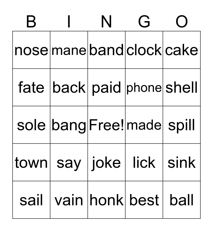 This bingo card has a free space and 24 words: say, vain, paid, sail, cake, nose, fate, mane, made, joke, phone, sole, lick, sink, back, best, spill, band, shell, bang, ball, town, clock and honk.