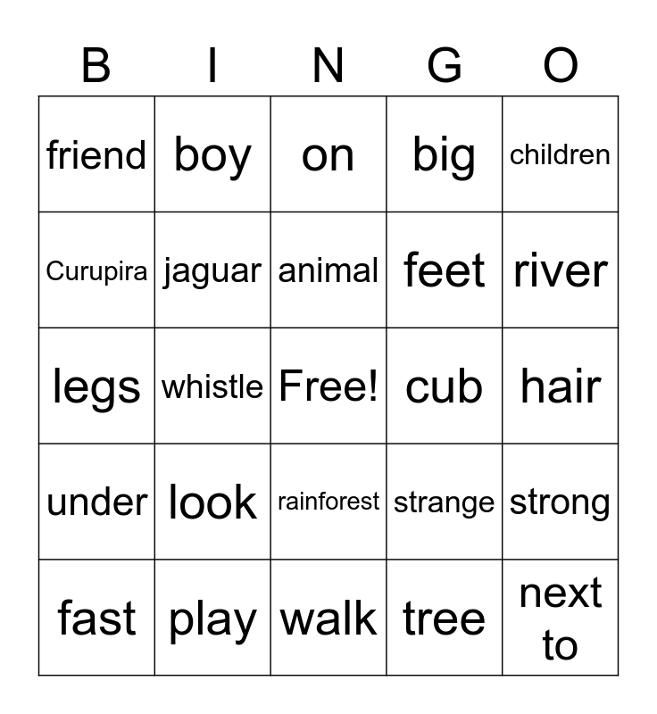 This bingo card has a free space and 26 words: rainforest, tree, animal, play, children, friend, Curupira, boy, hair, strange, feet, legs, strong, fast, whistle, safe, big, under, on, next to, river, walk, cub, look, jaguar and little.