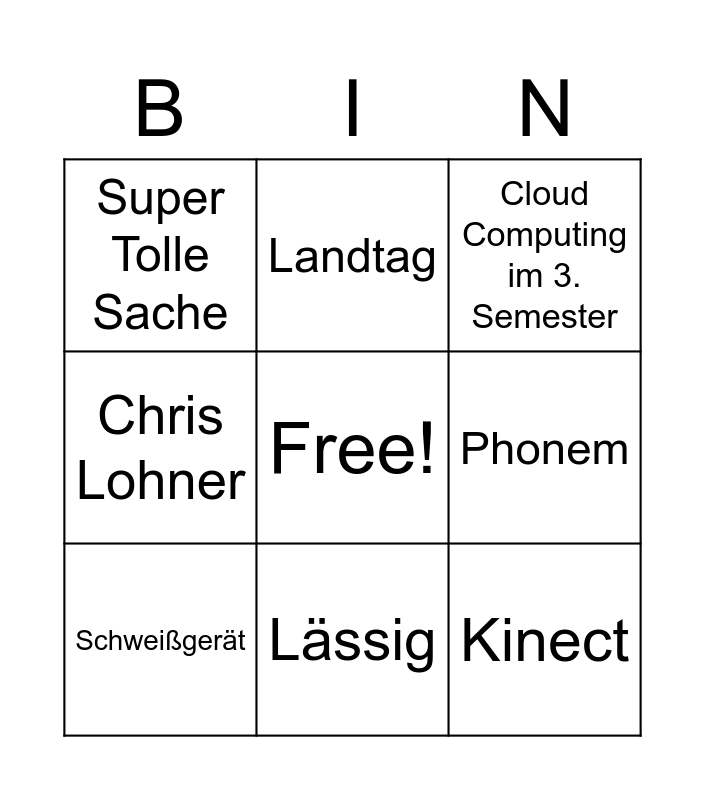 This bingo card has a free space and 14 words: Super Coole Sache, Fronius, Schweißgerät, Landtag, Chris Lohner, Kinect, Alexa, Microsoft, Lässig, Super Tolle Sache, Cepstrum, Phonem, Cloud Computing im 3. Semester and Nachhaltig.