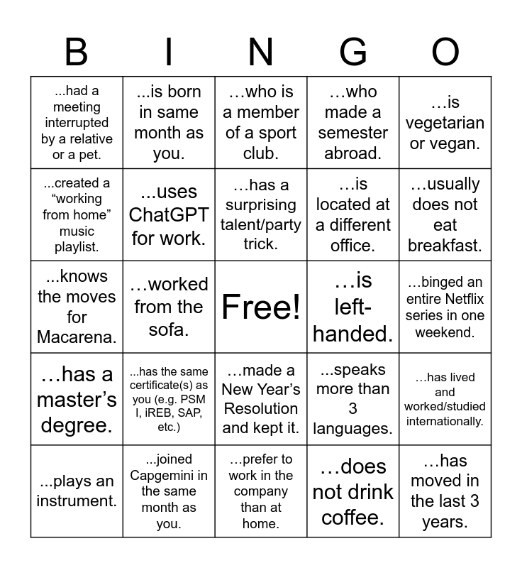 This bingo card has a free space and 24 words: ...has the same certificate(s) as you (e.g. PSM I, iREB, SAP, etc.), ...joined Capgemini in the same month as you., …has a surprising talent/party trick., ...plays an instrument., …is vegetarian or vegan., ...had a meeting interrupted by a relative or a pet., ...created a “working from home” music playlist., ...is born in same month as you., …is left-handed., …made a New Year’s Resolution and kept it., …is located at a different office., ...knows the moves for Macarena., ...speaks more than 3 languages., …has lived and worked/studied internationally., ...uses ChatGPT for work., …does not drink coffee., …binged an entire Netflix series in one weekend., …who is a member of a sport club., …usually does not eat breakfast., …worked from the sofa., …has moved in the last 3 years., …has a master’s degree., …who made a semester abroad. and …prefer to work in the company than at home..