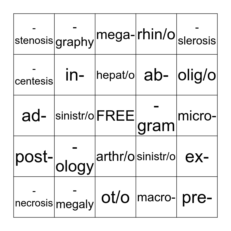 This bingo card has a free space and 24 words: -ology, -megaly, hepat/o, -necrosis, -slerosis, -stenosis, -centesis, -graphy, -gram, arthr/o, ab-, ad-, sinistr/o, ex-, in-, macro-, micro-, mega-, olig/o, sinistr/o, pre-, post-, rhin/o and ot/o.