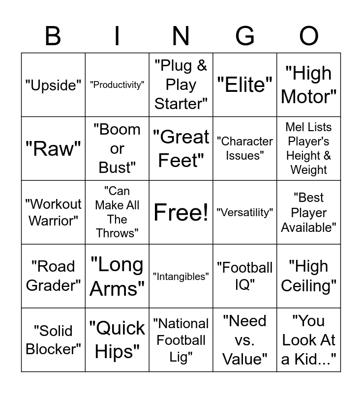 This bingo card has a free space and 24 words: "Long Arms", "Quick Hips", "Great Feet", "Solid Blocker", "High Motor", "Upside", "Raw", "Productivity", "Versatility", "Intangibles", "Character Issues", "Workout Warrior", "Football IQ", "High Ceiling", "Boom or Bust", "Need vs. Value", "Best Player Available", "Plug & Play Starter", Mel Lists Player's Height & Weight, "Can Make All The Throws", "You Look At a Kid...", "Road Grader", "Elite" and "National Football Lig".