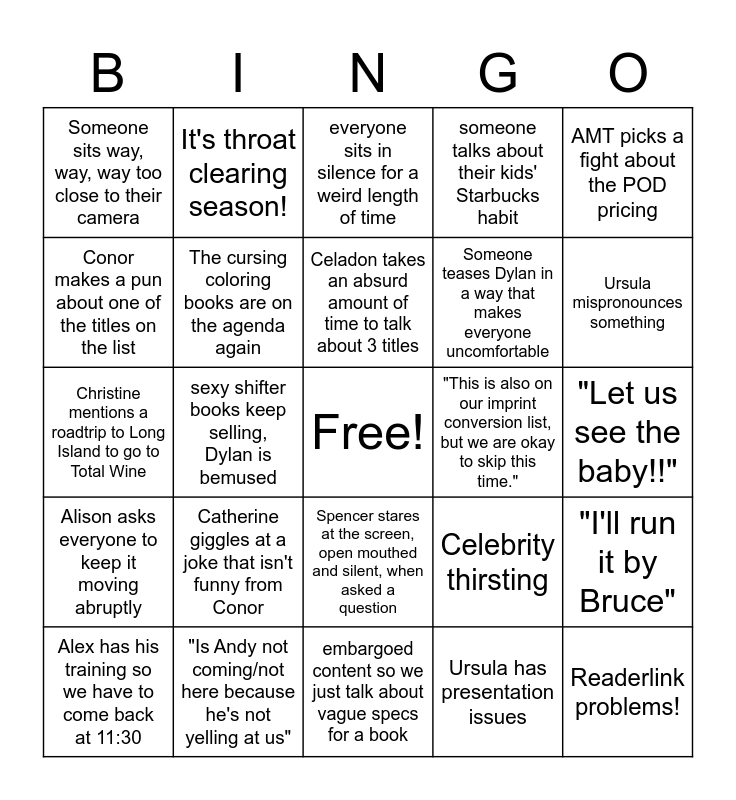 This bingo card has a free space and 24 words: Catherine giggles at a joke that isn't funny from Conor, "Is Andy not coming/not here because he's not yelling at us", Celadon takes an absurd amount of time to talk about 3 titles, Alex has his training so we have to come back at 11:30, AMT picks a fight about the POD pricing, Someone sits way, way, way too close to their camera, Conor makes a pun about one of the titles on the list, It's throat clearing season!, "This is also on our imprint conversion list, but we are okay to skip this time.", Spencer stares at the screen, open mouthed and silent, when asked a question, Someone teases Dylan in a way that makes everyone uncomfortable, Christine mentions a roadtrip to Long Island to go to Total Wine, Celebrity thirsting, "I'll run it by Bruce", The cursing coloring books are on the agenda again, Ursula has presentation issues, "Let us see the baby!!", everyone sits in silence for a weird length of time, Ursula mispronounces something, sexy shifter books keep selling, Dylan is bemused, Readerlink problems!, Alison asks everyone to keep it moving abruptly, someone talks about their kids' Starbucks habit and embargoed content so we just talk about vague specs for a book.