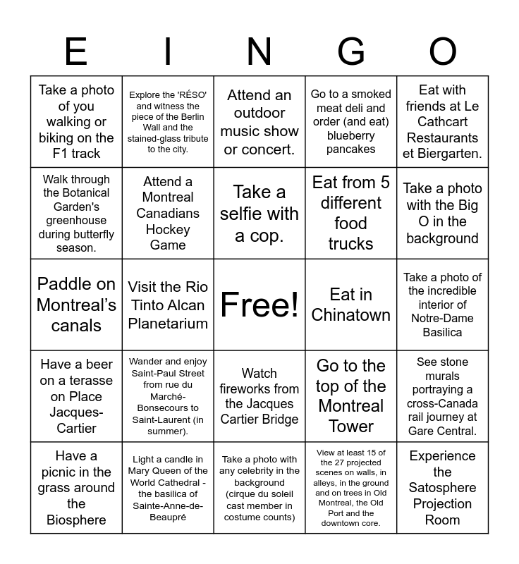 This bingo card has a free space and 24 words: Wander and enjoy Saint-Paul Street from rue du Marché-Bonsecours to Saint-Laurent (in summer)., Light a candle in Mary Queen of the World Cathedral - the basilica of Sainte-Anne-de-Beaupré, Take a selfie with a cop., Have a picnic in the grass around the Biosphere, Eat with friends at Le Cathcart Restaurants et Biergarten., Take a photo of you walking or biking on the F1 track, Walk through the Botanical Garden's greenhouse during butterfly season., Explore the 'RÉSO' and witness the piece of the Berlin Wall and the stained-glass tribute to the city., Eat in Chinatown, Watch fireworks from the Jacques Cartier Bridge, Eat from 5 different food trucks, Paddle on Montreal’s canals, Go to the top of the Montreal Tower, See stone murals portraying a cross-Canada rail journey at Gare Central., Attend a Montreal Canadians Hockey Game, View at least 15 of the 27 projected scenes on walls, in alleys, in the ground and on trees in Old Montreal, the Old Port and the downtown core., Take a photo of the incredible interior of Notre-Dame Basilica, Attend an outdoor music show or concert., Take a photo with the Big O in the background, Visit the Rio Tinto Alcan Planetarium, Experience the Satosphere Projection Room, Have a beer on a terasse on Place Jacques-Cartier, Go to a smoked meat deli and order (and eat) blueberry pancakes and Take a photo with any celebrity in the background (cirque du soleil cast member in costume counts).