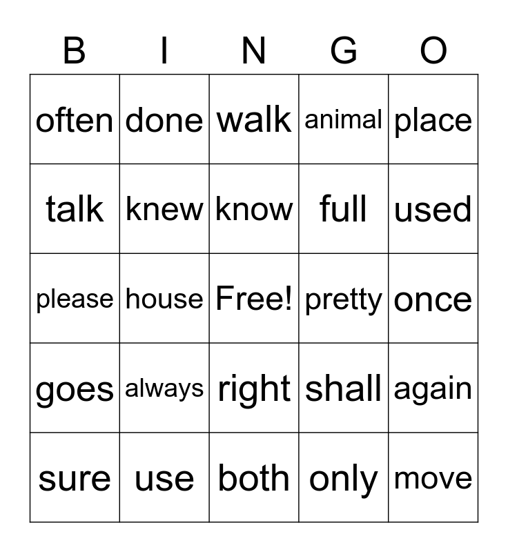 This bingo card has a free space and 27 words: shall, pull, full, both, talk, walk, done, goes, pretty, again, please, animal, sure, use, used, against, knew, know, always, often, once, only, house, move, right, place and together.