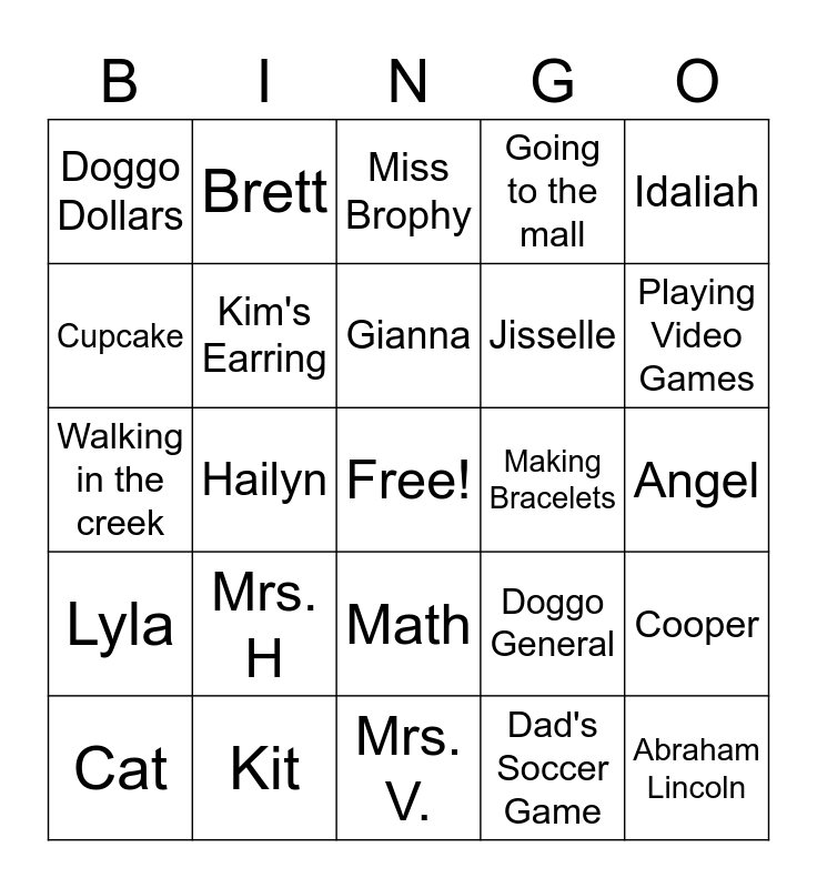 This bingo card has a free space and 24 words: Mrs. H, Kit, Gianna, Cat, Idaliah, Doggo Dollars, Cupcake, Brett, Making Bracelets, Math, Jisselle, Walking in the creek, Doggo General, Cooper, Kim's Earring, Dad's Soccer Game, Angel, Miss Brophy, Playing Video Games, Hailyn, Abraham Lincoln, Lyla, Going to the mall and Mrs. V..