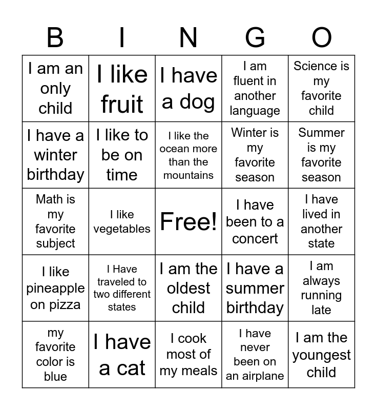 This bingo card has a free space and 24 words: I Have traveled to two different states, I have a cat, I like the ocean more than the mountains, my favorite color is blue, Science is my favorite child, I am an only child, I have a winter birthday, I like fruit, I have been to a concert, I am the oldest child, Winter is my favorite season, Math is my favorite subject, I have a summer birthday, I am always running late, I like to be on time, I have never been on an airplane, I have lived in another state, I have a dog, Summer is my favorite season, I like vegetables, I am the youngest child, I like pineapple on pizza, I am fluent in another language and I cook most of my meals.