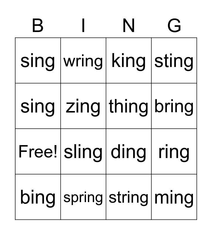 This bingo card has 20 words: bing, cling, king, ring, swing, sling, string, sting, Free!, wring, ding, bring, sing, spring, thing, wing, sing, zing, ying and ming.