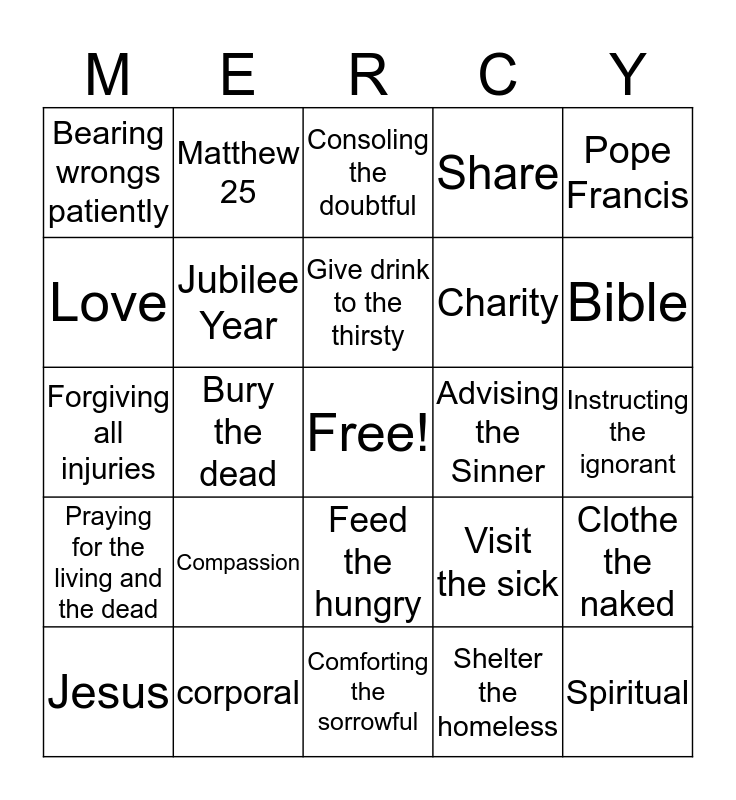 This bingo card has a free space and 24 words: Compassion, corporal, Give drink to the thirsty, Jesus, Pope Francis, Bearing wrongs patiently, Love, Matthew 25, Advising the Sinner, Feed the hungry, Charity, Forgiving all injuries, Visit the sick, Clothe the naked, Jubilee Year, Shelter the homeless, Instructing the ignorant, Consoling the doubtful, Bible, Bury the dead, Spiritual, Praying for the living and the dead, Share and Comforting the sorrowful.