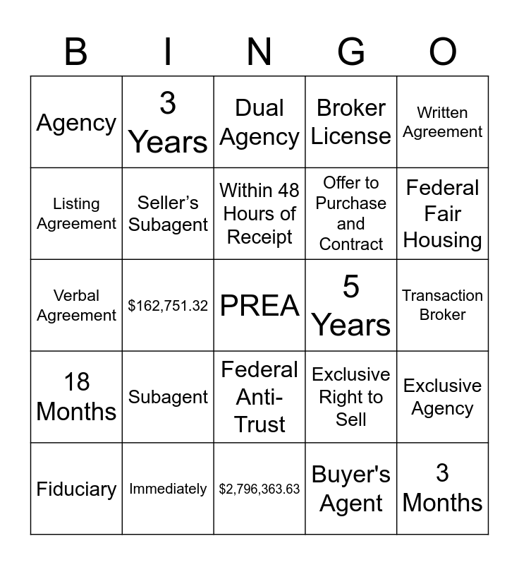 This bingo card has a free space and 24 words: Subagent, Immediately, Within 48 Hours of Receipt, Fiduciary, Written Agreement, Agency, Listing Agreement, 3 Years, 5 Years, Federal Anti-Trust, Offer to Purchase and Contract, Verbal Agreement, Exclusive Right to Sell, Exclusive Agency, Seller’s Subagent, Buyer's Agent, Transaction Broker, Dual Agency, Federal Fair Housing, $162,751.32, 3 Months, 18 Months, Broker License and $2,796,363.63.