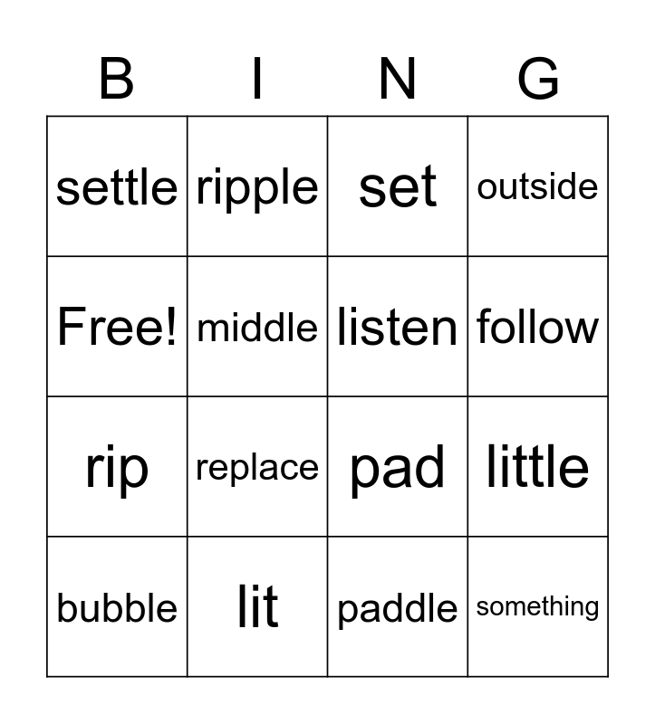 This bingo card has 16 words: lit, little, set, settle, rip, ripple, pad, paddle, Free!, middle, bubble, outside, replace, follow, listen and something.