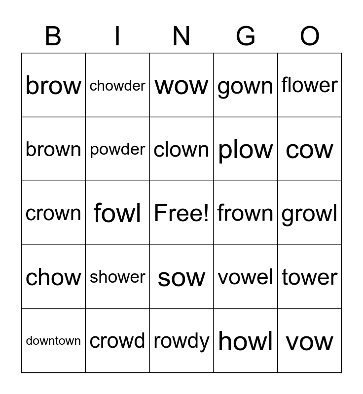 This bingo card has a free space and 24 words: shower, crowd, clown, downtown, flower, brow, brown, chowder, frown, sow, plow, crown, vowel, tower, powder, howl, growl, wow, cow, fowl, vow, chow, gown and rowdy.