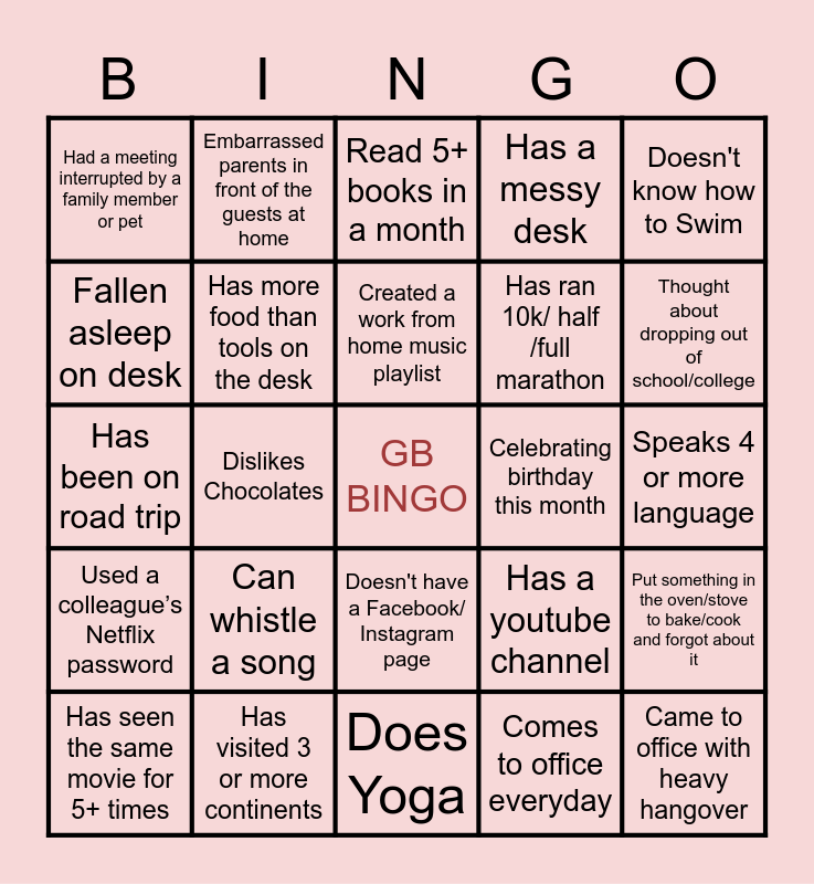 This bingo card has a free space and 24 words: Can whistle a song, Has visited 3 or more continents, Created a work from home music playlist, Has seen the same movie for 5+ times, Doesn't know how to Swim, Had a meeting interrupted by a family member or pet, Fallen asleep on desk, Embarrassed parents in front of the guests at home, Celebrating birthday this month, Doesn't have a Facebook/ Instagram page, Has ran 10k/ half /full marathon, Has been on road trip, Has a youtube channel, Put something in the oven/stove to bake/cook and forgot about it, Has more food than tools on the desk, Comes to office everyday, Speaks 4 or more language, Read 5+ books in a month, Thought about dropping out of school/college, Dislikes Chocolates, Came to office with heavy hangover, Used a colleague’s Netflix password, Has a messy desk and Does Yoga.