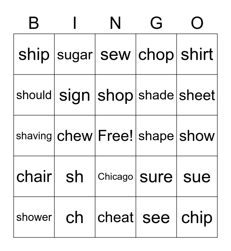 This bingo card has a free space and 24 words: sh, ch, shop, shower, shirt, ship, should, sugar, shape, Chicago, shade, shaving, sure, sue, sign, see, show, sew, sheet, chew, chip, chair, chop and cheat.