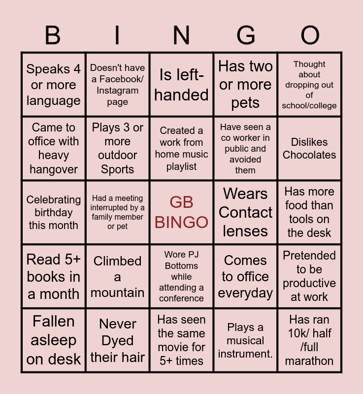 This bingo card has a free space and 24 words: Climbed a mountain, Never Dyed their hair, Created a work from home music playlist, Fallen asleep on desk, Thought about dropping out of school/college, Speaks 4 or more language, Came to office with heavy hangover, Doesn't have a Facebook/ Instagram page, Wears Contact lenses, Wore PJ Bottoms while attending a conference, Have seen a co worker in public and avoided them, Celebrating birthday this month, Comes to office everyday, Pretended to be productive at work, Plays 3 or more outdoor Sports, Plays a musical instrument., Has more food than tools on the desk, Is left-handed, Dislikes Chocolates, Had a meeting interrupted by a family member or pet, Has ran 10k/ half /full marathon, Read 5+ books in a month, Has two or more pets and Has seen the same movie for 5+ times.
