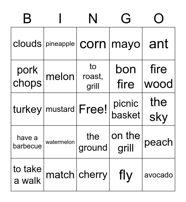 This bingo card has a free space and 24 words: watermelon, match, to roast, grill, to take a walk, ant, clouds, pork chops, pineapple, picnic basket, the ground, bon fire, turkey, on the grill, peach, melon, fly, the sky, corn, fire wood, mustard, avocado, have a barbecue, mayo and cherry.