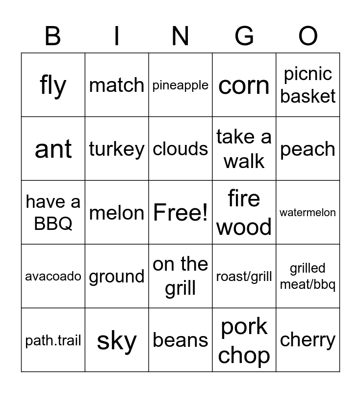 This bingo card has a free space and 24 words: ground, sky, clouds, path.trail, picnic basket, fly, ant, match, fire wood, on the grill, take a walk, have a BBQ, roast/grill, grilled meat/bbq, turkey, pork chop, watermelon, pineapple, peach, melon, cherry, avacoado, corn and beans.