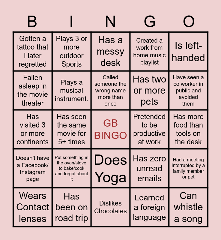 This bingo card has a free space and 24 words: Put something in the oven/stove to bake/cook and forgot about it, Has been on road trip, Called someone the wrong name more than once, Wears Contact lenses, Is left-handed, Gotten a tattoo that I later regretted, Fallen asleep in the movie theater, Plays 3 or more outdoor Sports, Pretended to be productive at work, Does Yoga, Has two or more pets, Has visited 3 or more continents, Has zero unread emails, Had a meeting interrupted by a family member or pet, Plays a musical instrument., Learned a foreign language, Has more food than tools on the desk, Has a messy desk, Have seen a co worker in public and avoided them, Has seen the same movie for 5+ times, Can whistle a song, Doesn't have a Facebook/ Instagram page, Created a work from home music playlist and Dislikes Chocolates.