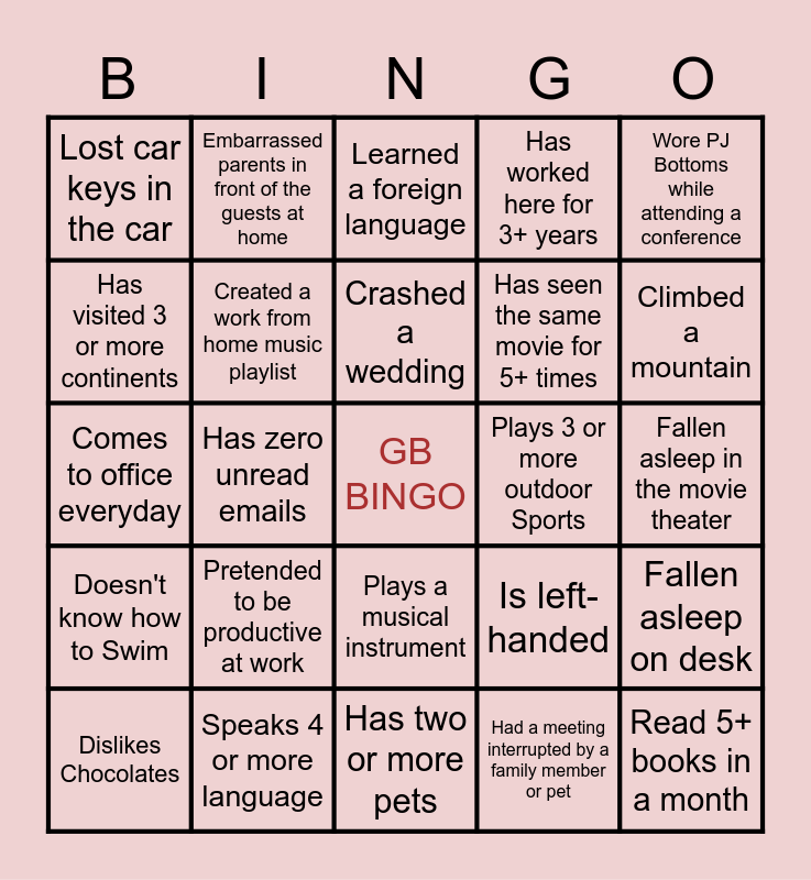 This bingo card has a free space and 24 words: Pretended to be productive at work, Speaks 4 or more language, Crashed a wedding, Dislikes Chocolates, Wore PJ Bottoms while attending a conference, Lost car keys in the car, Has visited 3 or more continents, Embarrassed parents in front of the guests at home, Plays 3 or more outdoor Sports, Plays a musical instrument, Has seen the same movie for 5+ times, Comes to office everyday, Is left-handed, Fallen asleep on desk, Created a work from home music playlist, Had a meeting interrupted by a family member or pet, Fallen asleep in the movie theater, Learned a foreign language, Climbed a mountain, Has zero unread emails, Read 5+ books in a month, Doesn't know how to Swim, Has worked here for 3+ years and Has two or more pets.