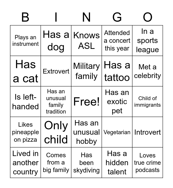 This bingo card has a free space and 24 words: Only child, Comes from a big family, Military family, Lived in another country, In a sports league, Plays an instrument, Has a cat, Has a dog, Has an exotic pet, Has an unusual hobby, Has a tattoo, Is left-handed, Vegetarian, Introvert, Extrovert, Has a hidden talent, Child of immigrants, Knows ASL, Met a celebrity, Has an unusual family tradition, Loves true crime podcasts, Likes pineapple on pizza, Attended a concert this year and Has been skydiving.