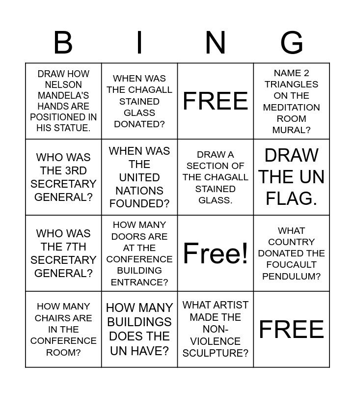 This bingo card has 1 images and 18 words: Free!, FREE, FREE, WHAT COUNTRY DONATED THE FOUCAULT PENDULUM?, WHO WAS THE 3RD SECRETARY GENERAL?, WHAT ARTIST MADE THE NON-VIOLENCE SCULPTURE?, DRAW HOW NELSON MANDELA'S HANDS ARE POSITIONED IN HIS STATUE., WHEN WAS THE CHAGALL STAINED GLASS DONATED?, WHO WAS THE 7TH SECRETARY GENERAL?, HOW MANY DOORS ARE AT THE CONFERENCE BUILDING ENTRANCE?, WHEN WAS THE UNITED NATIONS FOUNDED?, DRAW A SECTION OF THE CHAGALL STAINED GLASS., HOW MANY BUILDINGS DOES THE UN HAVE?, HOW MANY CHAIRS ARE IN THE CONFERENCE ROOM?, WHEN WAS THE MEDITATION ROOM OPEN?, NAME 2 TRIANGLES ON THE MEDITATION ROOM MURAL?, DRAW THE UN FLAG. and HOW MANY BUTTONS ARE BUTTONED ON NELSON MANDELA'S JACKET?.