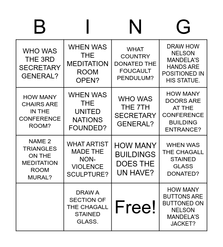 This bingo card has 1 images and 16 words: Free!, WHAT COUNTRY DONATED THE FOUCAULT PENDULUM?, WHO WAS THE 3RD SECRETARY GENERAL?, WHAT ARTIST MADE THE NON-VIOLENCE SCULPTURE?, DRAW HOW NELSON MANDELA'S HANDS ARE POSITIONED IN HIS STATUE., WHEN WAS THE CHAGALL STAINED GLASS DONATED?, WHO WAS THE 7TH SECRETARY GENERAL?, HOW MANY DOORS ARE AT THE CONFERENCE BUILDING ENTRANCE?, WHEN WAS THE UNITED NATIONS FOUNDED?, DRAW A SECTION OF THE CHAGALL STAINED GLASS., HOW MANY BUILDINGS DOES THE UN HAVE?, HOW MANY CHAIRS ARE IN THE CONFERENCE ROOM?, WHEN WAS THE MEDITATION ROOM OPEN?, NAME 2 TRIANGLES ON THE MEDITATION ROOM MURAL?, DRAW THE UN FLAG. and HOW MANY BUTTONS ARE BUTTONED ON NELSON MANDELA'S JACKET?.