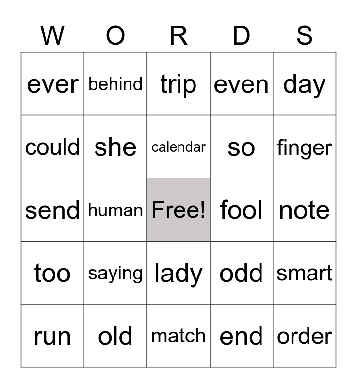 This bingo card has a free space and 59 words: not, old, other, too, end, from, she, enough, so, it, even, to, could, before, some, ever, order, day, best, calendar, fool, trip, run, smart, child, terrible, dare, pocket, finger, shot, midnight, fourth, prince, trade, behind, office, iron, human, try, send, table, saying, note, win, crown, prize, upper, reach, lady, match, crime, exactly, story, ball, plug, odd, danger, sky and written.