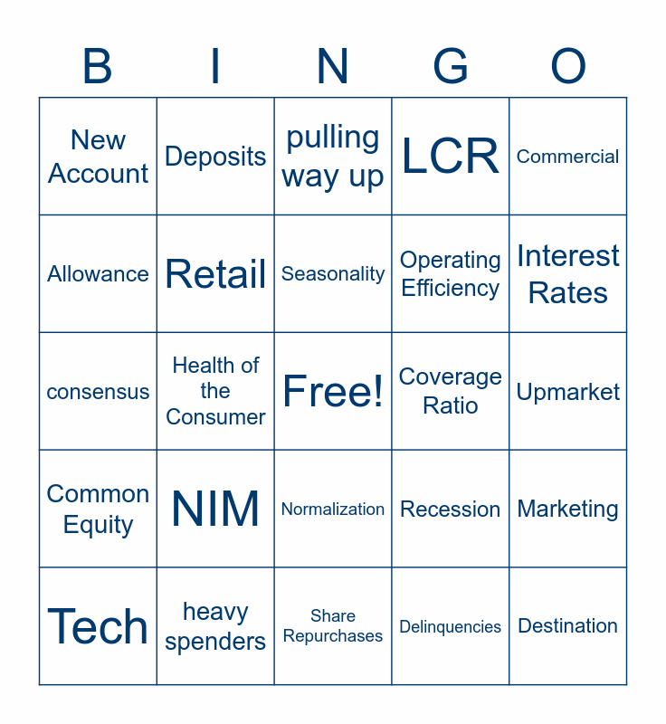 This bingo card has a free space and 48 words: CCAR, Destination, AOCI, Share Repurchases, NIM, Growth, Deposits, Card, Allowance, Liquidity, Retail, LCR, Marketing, Recession, Resilient, Competition, Seasonality, Coverage Ratio, Auto, Commercial, Health of the Consumer, Delinquencies, New Account, Operating Efficiency, Guidance, Interest Rates, Tech, NACO, Normalization, Common Equity, CET1, unmute, zig, zag, heavy spenders, PVOL, SVB, Upmarket, shopping platform, First Republic, FDIC, Market Factors, pulling way up, little cat feet, consensus, EPS, insured deposits and loan growth.