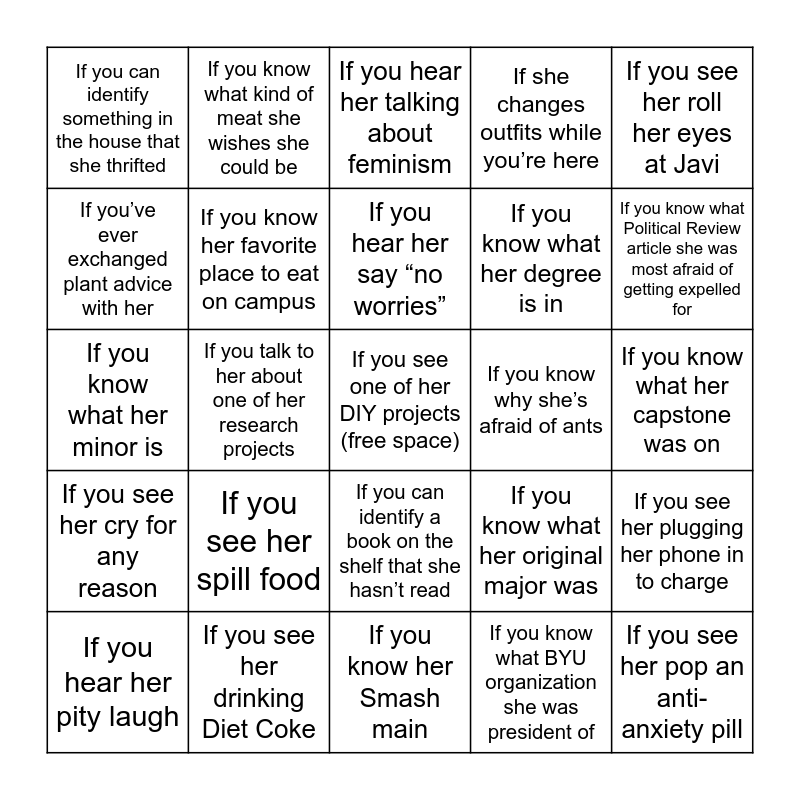 This bingo card has a free space and 24 words: If you see her spill food, If you see her drinking Diet Coke, If you hear her say “no worries”, If you hear her pity laugh, If you see her roll her eyes at Javi, If you can identify something in the house that she thrifted, If you’ve ever exchanged plant advice with her, If you know what kind of meat she wishes she could be, If you know why she’s afraid of ants, If you can identify a book on the shelf that she hasn’t read, If you know what her degree is in, If you know what her minor is, If you know what her original major was, If you see her plugging her phone in to charge, If you know her favorite place to eat on campus, If you know what BYU organization she was president of, If you know what her capstone was on, If you hear her talking about feminism, If you know what Political Review article she was most afraid of getting expelled for, If you talk to her about one of her research projects, If you see her pop an anti-anxiety pill, If you see her cry for any reason, If she changes outfits while you’re here and If you know her Smash main.