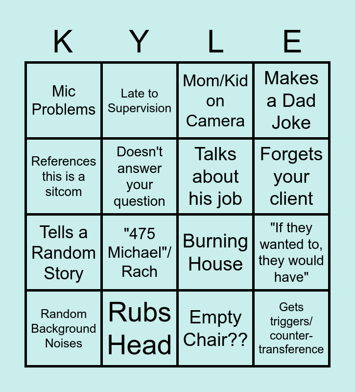 This bingo card has 16 words: Rubs Head, "If they wanted to, they would have", Mom/Kid on Camera, Mic Problems, Tells a Random Story, Late to Supervision, Burning House, Empty Chair??, References this is a sitcom, Doesn't answer your question, Random Background Noises, Makes a Dad Joke, "475 Michael"/ Rach, Forgets your client, Talks about his job and Gets triggers/ counter-transference.