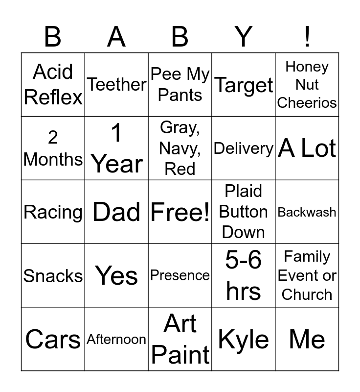 This bingo card has a free space and 24 words: Yes, Afternoon, Gray, Navy, Red, Cars, Honey Nut Cheerios, Acid Reflex, 2 Months, Teether, Plaid Button Down, Presence, Delivery, Racing, 5-6 hrs, Family Event or Church, 1 Year, Kyle, Backwash, Pee My Pants, A Lot, Dad, Me, Snacks, Target and Art Paint.