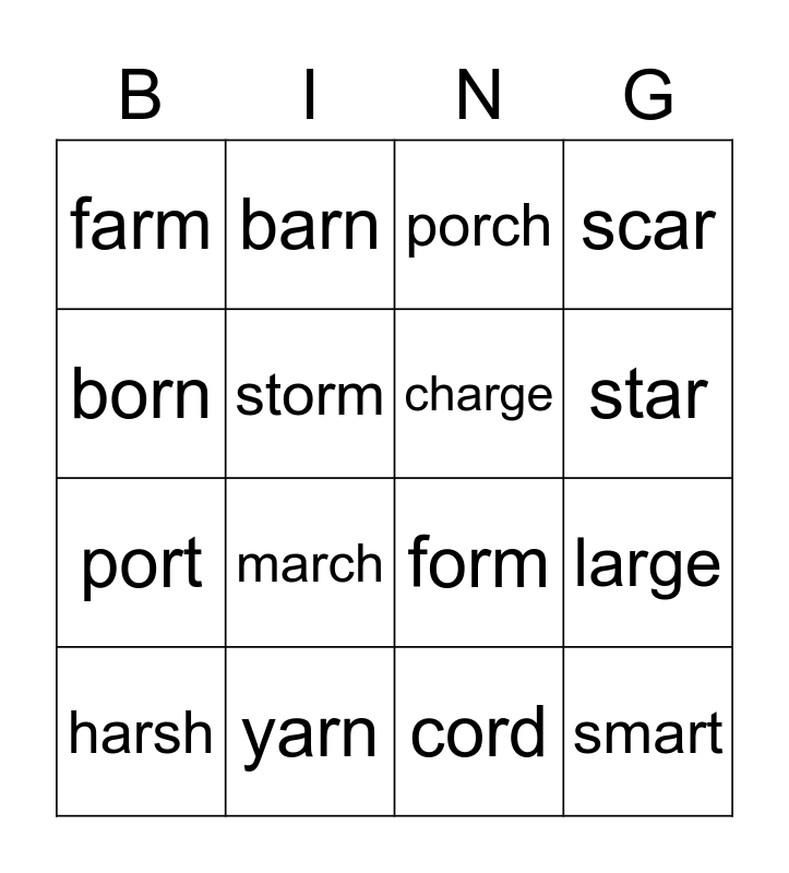 This bingo card has 25 words: Free!, fort, star, part, born, farm, storm, barn, yarn, yard, port, form, fork, north, charge, tart, cord, porch, march, large, harsh, short, smart, scar and torn.