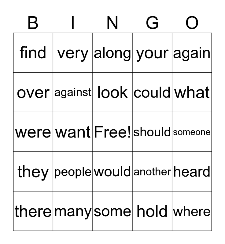 This bingo card has a free space and 24 words: people, many, look, there, again, find, over, very, should, would, could, were, another, heard, against, hold, someone, along, what, want, where, they, your and some.