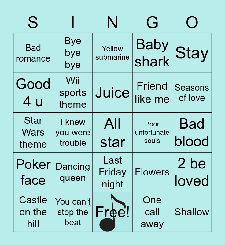 This bingo card has 1 images and 25 words: Poker face, You can’t stop the beat, All star, One call away, Stay, Bad romance, Bye bye bye, Yellow submarine, Poor unfortunate souls, 2 be loved, Good 4 u, Wii sports theme, Free!, Flowers, Seasons of love, Castle on the hill, I knew you were trouble, Juice, Friend like me, Bad blood, Star Wars theme, Dancing queen, Last Friday night, Baby shark and Shallow.