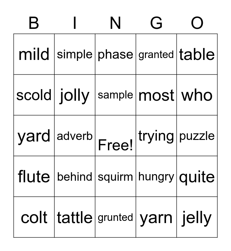 This bingo card has a free space and 24 words: behind, tattle, sample, colt, table, mild, scold, simple, trying, squirm, most, yard, hungry, quite, jolly, yarn, puzzle, phase, who, adverb, jelly, flute, granted and grunted.