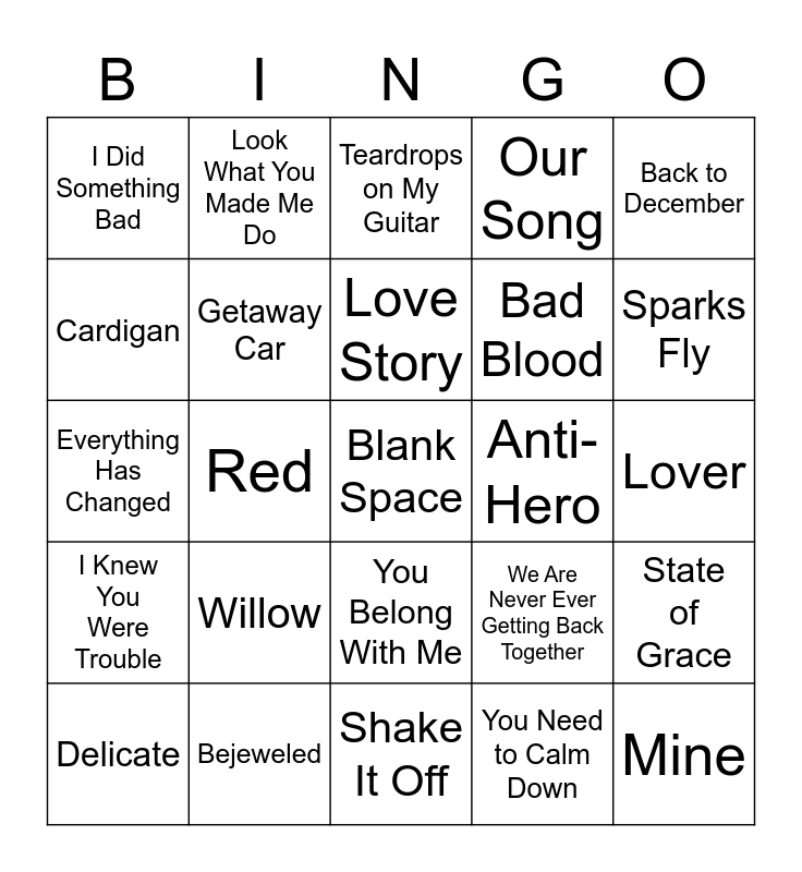 This bingo card has a free space and 39 words: All Too Well, Style, Wildest Dreams, Getaway Car, Delicate, You Belong With Me, Love Story, Enchanted, Back to December, I Knew You Were Trouble, Red, Our Song, Mine, Lover, Anti-Hero, Willow, 22, I Did Something Bad, Clean, We Are Never Ever Getting Back Together, Cardigan, Shake It Off, Bad Blood, Sparks Fly, Fearless, Mean, The Story of Us, Cruel Summer, Me!, Look What You Made Me Do, Evermore, White Horse, Teardrops on My Guitar, Bejeweled, You Need to Calm Down, Fifteen, State of Grace, Everything Has Changed and I Don't Wanna Live Forever.