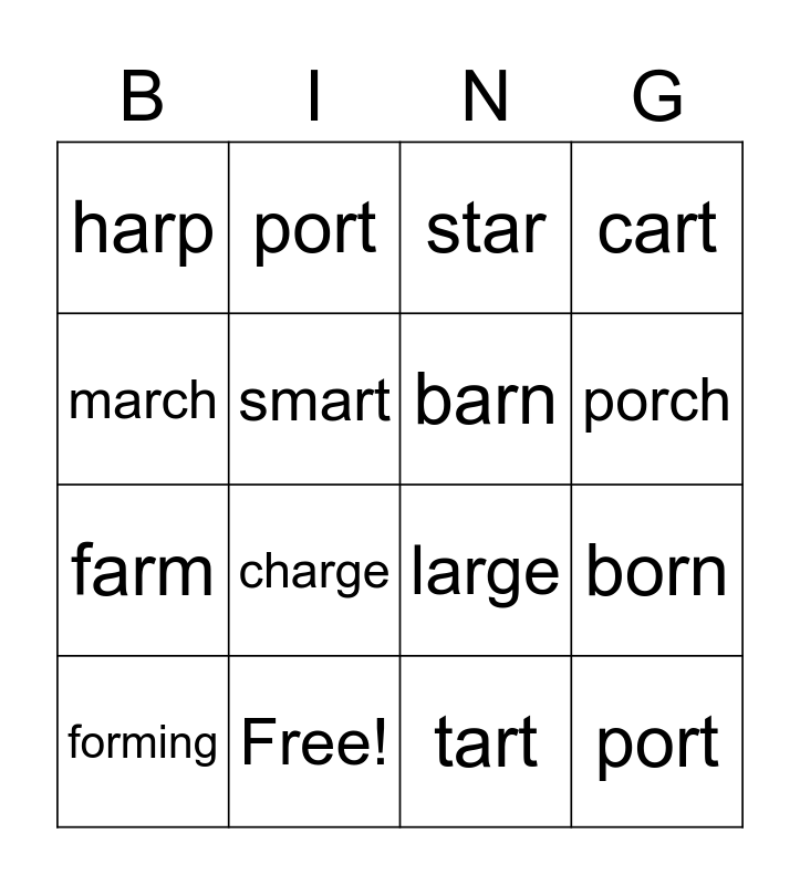 This bingo card has 22 words: Free!, north, port, short, smart, barn, harp, star, large, port, farm, cart, storm, fork, tart, thorn, born, forming, charge, march, porch and short.