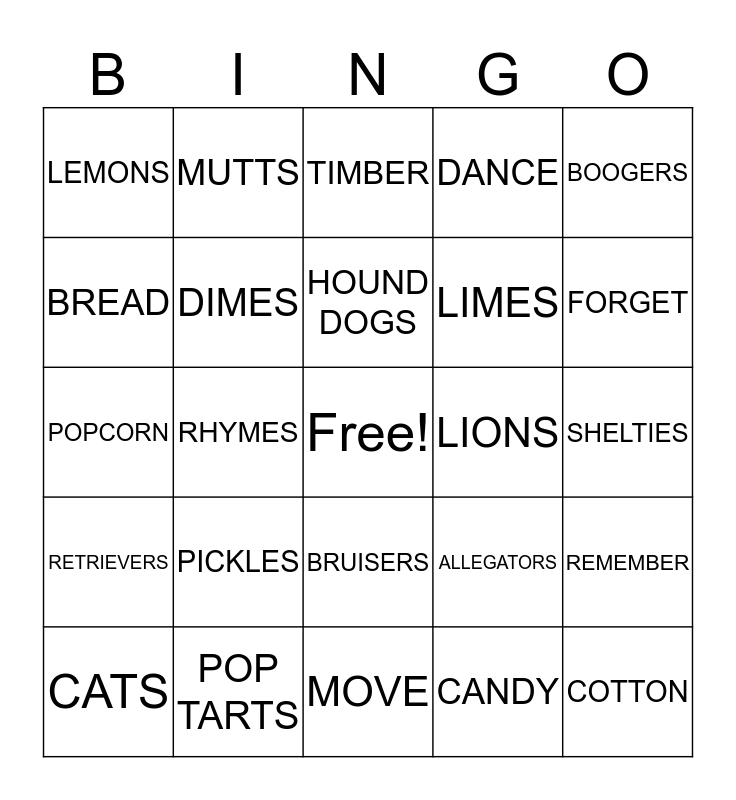 This bingo card has a free space and 24 words: PICKLES, POP TARTS, HOUND DOGS, CATS, BOOGERS, LEMONS, BREAD, MUTTS, LIONS, BRUISERS, LIMES, POPCORN, ALLEGATORS, REMEMBER, DIMES, CANDY, SHELTIES, TIMBER, FORGET, RHYMES, COTTON, RETRIEVERS, DANCE and MOVE.