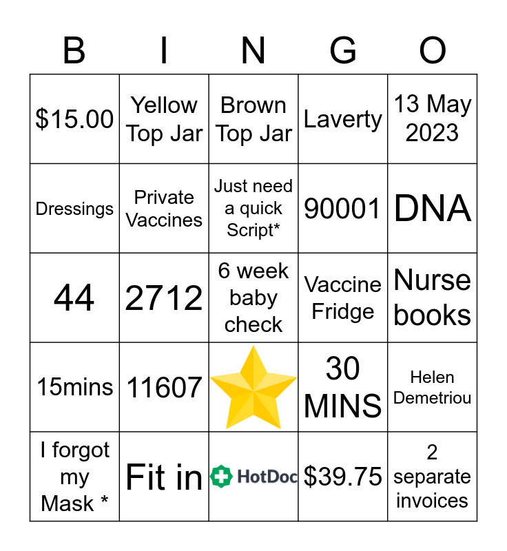 This bingo card has 2 images and 23 words: 15mins, Fit in, 6 week baby check, $39.75, 13 May 2023, $15.00, Yellow Top Jar, Brown Top Jar, Vaccine Fridge, Helen Demetriou, Dressings, Private Vaccines, 30 MINS, DNA, I forgot my Mask *, 2712, Just need a quick Script*, 90001, Nurse books, 44, 11607, Laverty and 2 separate invoices.